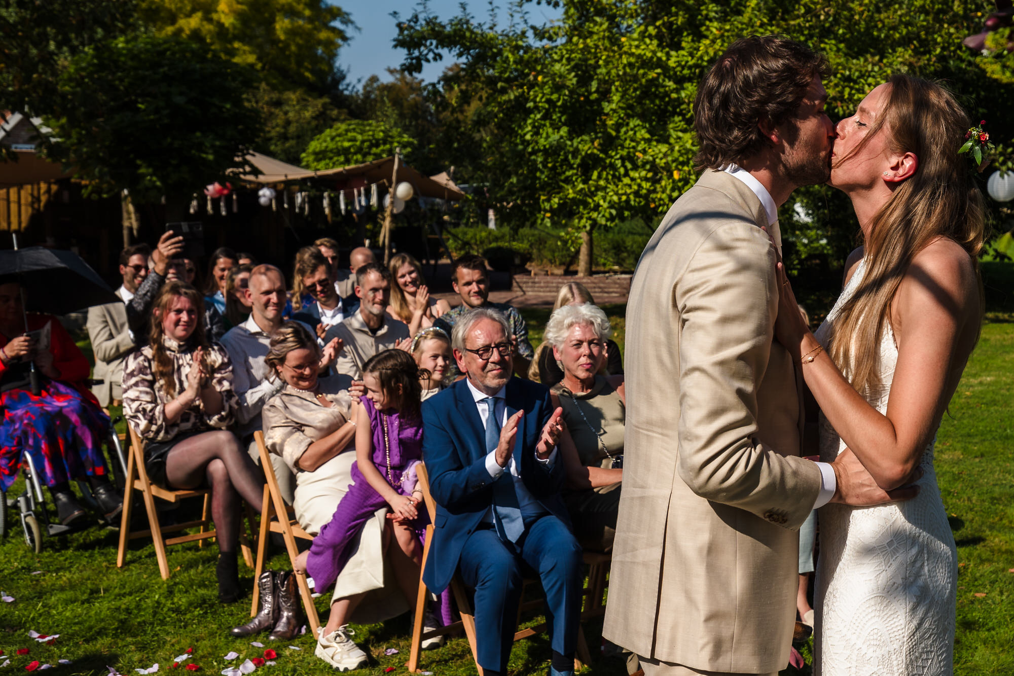 Hofstede De Middelburg in Laren is een heerlijke plek voor een bruiloft. De locatie is prettig en de groene omgeving leent zich goed voor een mooie reportage. Romy en Roy hadden er een heerlijk ontspannen dag van gemaakt, met veel persoonlijke elementen. Natuurlijk was hun geliefde hond van de partij, en speciaal voor ballonvaarder Roy werd ’s avonds een heuse luchtballon opgetuigd – uiteraard een goede gelegenheid voor een foto.