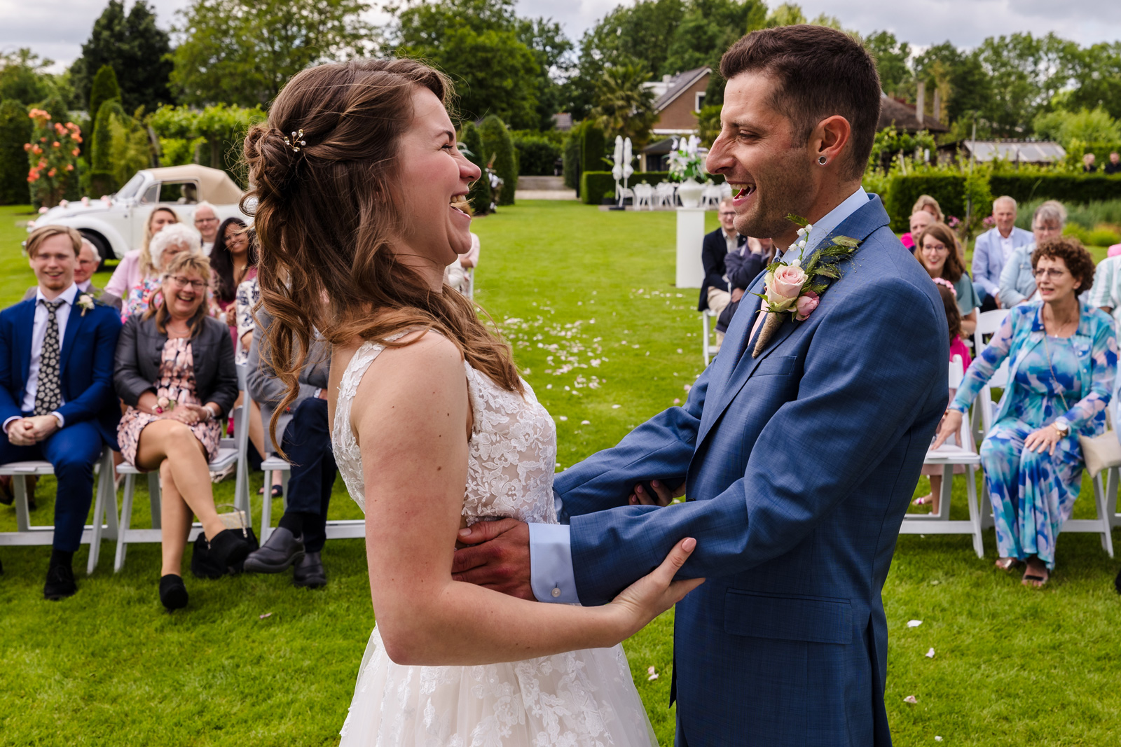 Ook veel vrienden en familieleden waren heel erg over Jeroen te spreken. Zij gaven aan dat ze Jeroen een prettig persoon vonden en tegelijkertijd zijn aanwezigheid ook amper opmerkten. Dat is precies zoals we het wilden, zodat iedereen zo puur en echt mogelijk op de foto’s staat. Tijdens onze ceremonie hebben we beiden niet doorgehad dat Jeroen foto’s maakte, terwijl uiteindelijk wel iedere lach en traan op de foto staat. Ook had Jeroen super goed door wie voor ons de belangrijkste personen waren die dag. Onze beste vrienden en meest dichtbije familie staat ook het meest op de foto, dat vinden we heel waardevol om terug te zien. Jeroen liet ook bij de groepsfoto’s iedereen zich op zijn gemak voelen en kwam met leuke en creatieve opdrachten om ervoor te zorgen dat de foto’s spontaan waren en niet statisch.